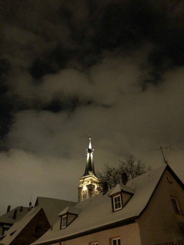 Der Kirchturm der Schwabacher Stadtkirche im Lichterschein