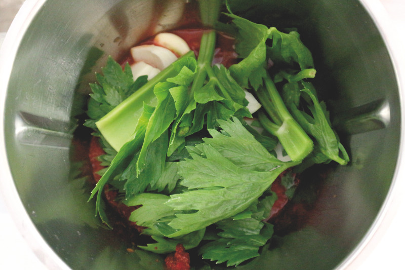 Zutaten für die schnelle Tomatensoße in den Mixer geben